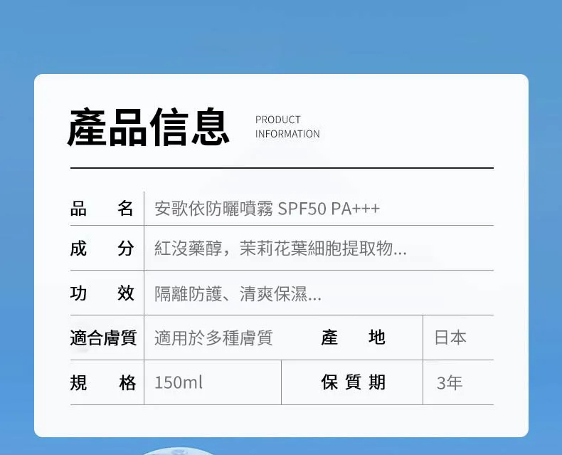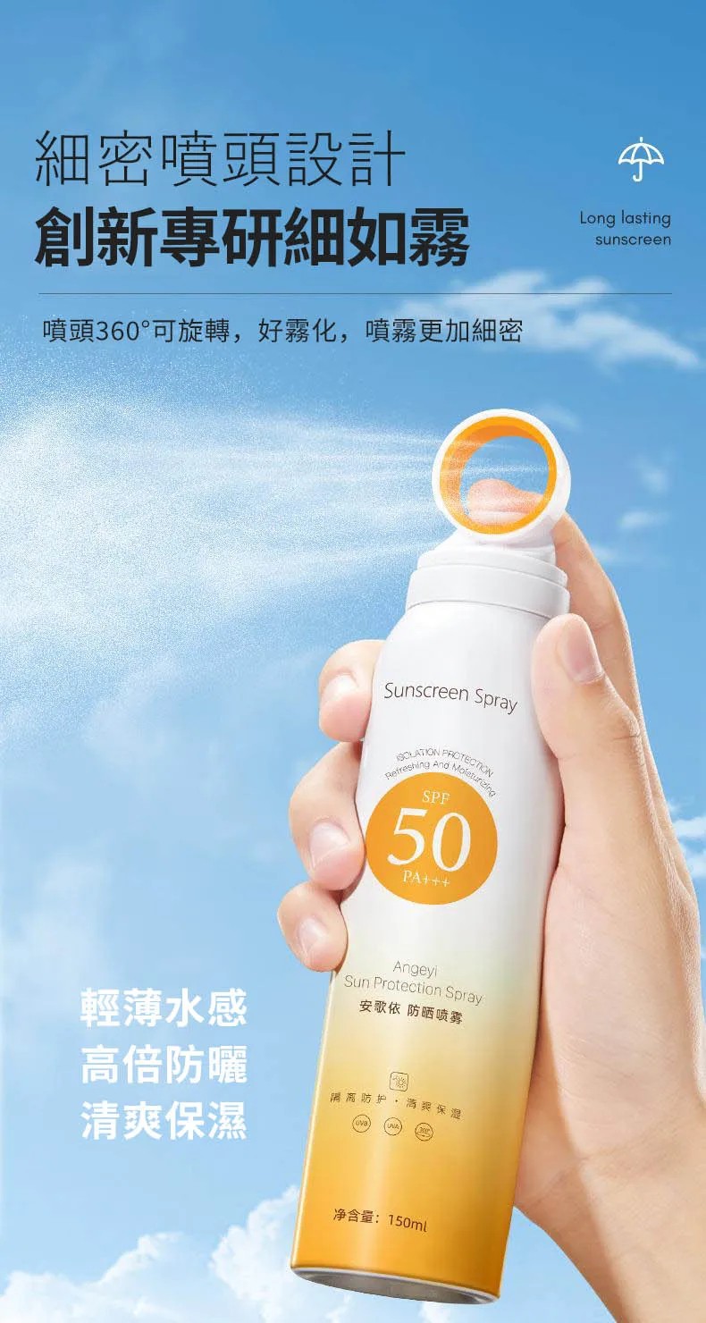 15分鐘前安歌依光圈防曬噴霧,細密噴頭設計 噴頭360°可旋轉自然膚惑,隔離防曬一瓶搞定 - 僅此一天「安歌依光圈防曬噴霧」8入72%用戶的選擇!NT$1598【限時免運】